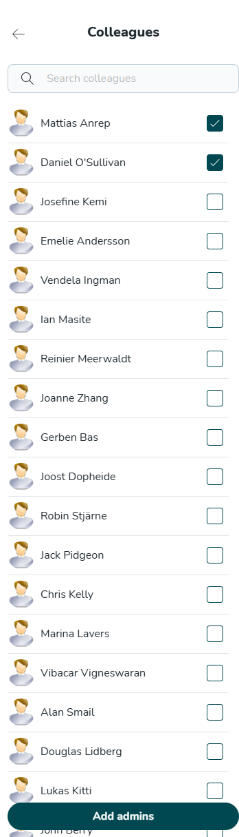 - Wählen Sie die Benutzer aus, denen Sie Administratorrechte erteilen möchten, und klicken Sie auf die Schaltfläche Administratoren hinzufügen.