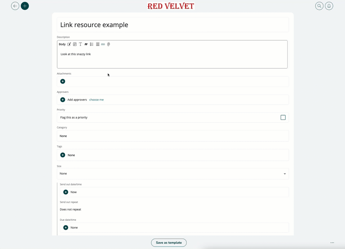 - In der Detailansicht können Sie zusätzliche Informationen wie ein Titelbild, Anhänge, Kategorie und mehr hinzufügen. Wenn Sie einen Link zu einer Ressource hinzufügen möchten, können Sie ihn im Beschreibungsfeld hinzufügen.