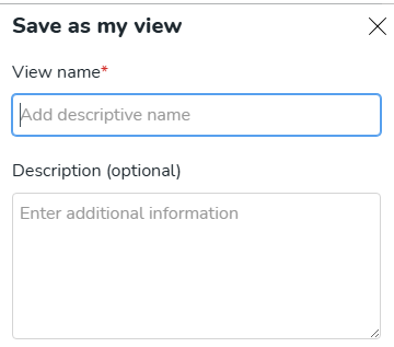 Schaltfläche Als meine Ansicht speichern | Klicken Sie auf die Schaltfläche „Als meine Ansicht speichern“, um eine Filtersuche, die Sie für die Zukunft behalten möchten, unter einem Namen und einer optionalen Beschreibung zu speichern. Dieser gespeicherte Filter erscheint im ersten Abschnitt des Filterfensters, der, wie zu Beginn dieses Artikels erwähnt, Meine Ansichten heißt. ![]() Die folgenden Faktoren werden gespeichert, wenn Sie eine Ansicht speichern: