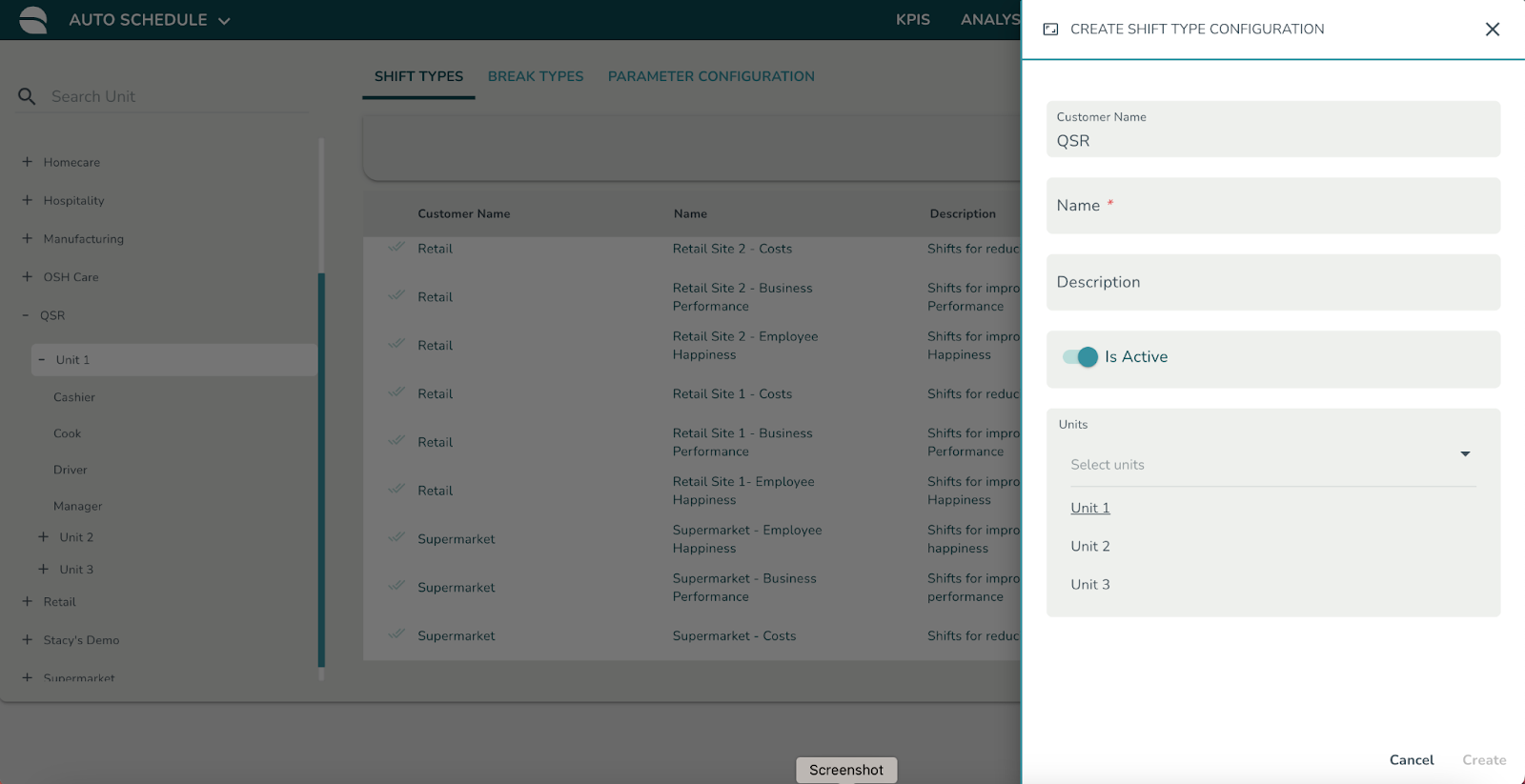 Einheiten | Wählen Sie die Einheit(en) aus, auf die die Schichtregeln anwendbar sind. Wenn Sie keine der Einheiten auswählen, wird angenommen, dass die Schichtregeln für alle Einheiten innerhalb des ausgewählten Kunden gelten |