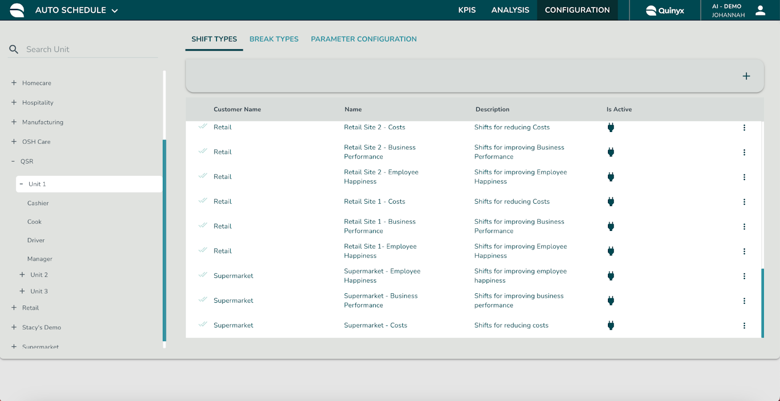 Sobald die Schichttyp-Konfiguration zur Tabelle hinzugefügt wurde, können Sie auf die Konfiguration klicken, um die tatsächlichen Schichtregeln weiter zu konfigurieren. Wählen Sie das + Symbol in der oberen rechten Ecke, um die spezifischen Schichtregeln zu konfigurieren, die in Pythia (KI-Optimierung) als Schichttyp-Definitionen bezeichnet werden.