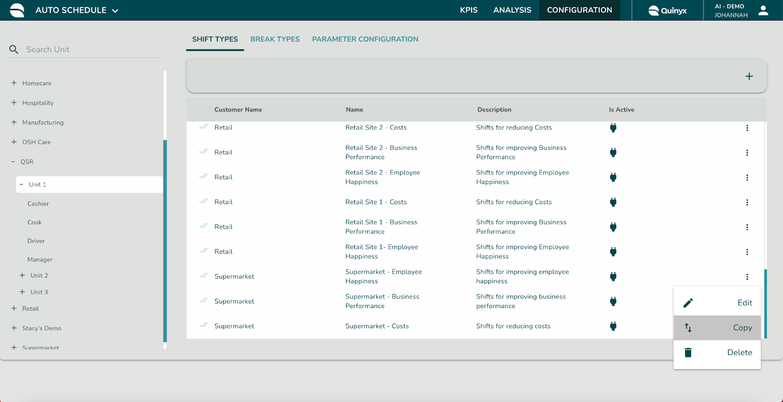 - Regeln kopieren: Um Zeit zu sparen, wählen Sie Kopieren aus dem Drei-Punkte-Menü, um einen Regelsatz zu duplizieren. Verwenden Sie das Bearbeitungsfeld der kopierten Konfiguration, um die neuen relevanten Einheiten oder Sektionen auszuwählen.