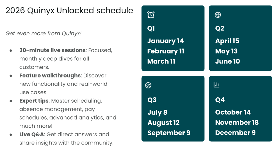 Maximize your Quinyx experience in 2026 with our Quinyx Unlocked webinar series. Designed as focused, 30-minute monthly deep dives, these sessions provide a dedicated space for all customers to explore new feature walkthroughs, master complex workflows like absence management and advanced analytics, and gain exclusive expert tips. Whether you’re looking to streamline your scheduling or engage in live Q&A with our product specialists, this year-long roadmap ensures you stay ahead of the curve and get the most out of your workforce management tools.