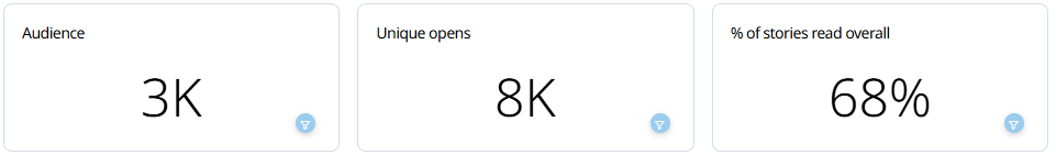 In the metric overview, you can see the total amount of three different values. These values are Audience, Unique opens, and % of stories read overall. With the overview, you can see how many people are looking at the stories sent and how many of the stories are getting read by your workforce.