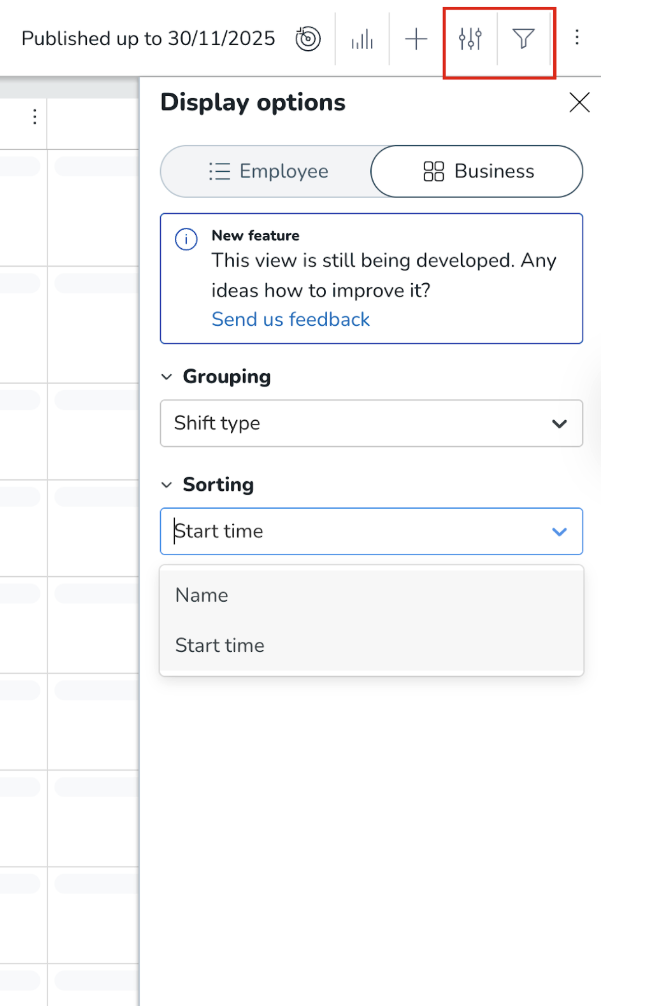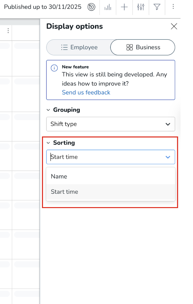 The Business view now gives you more ways to organize how groups (shift types or sections) are displayed. Previously, groups were always sorted alphabetically - now, you can choose between multiple sorting methods.