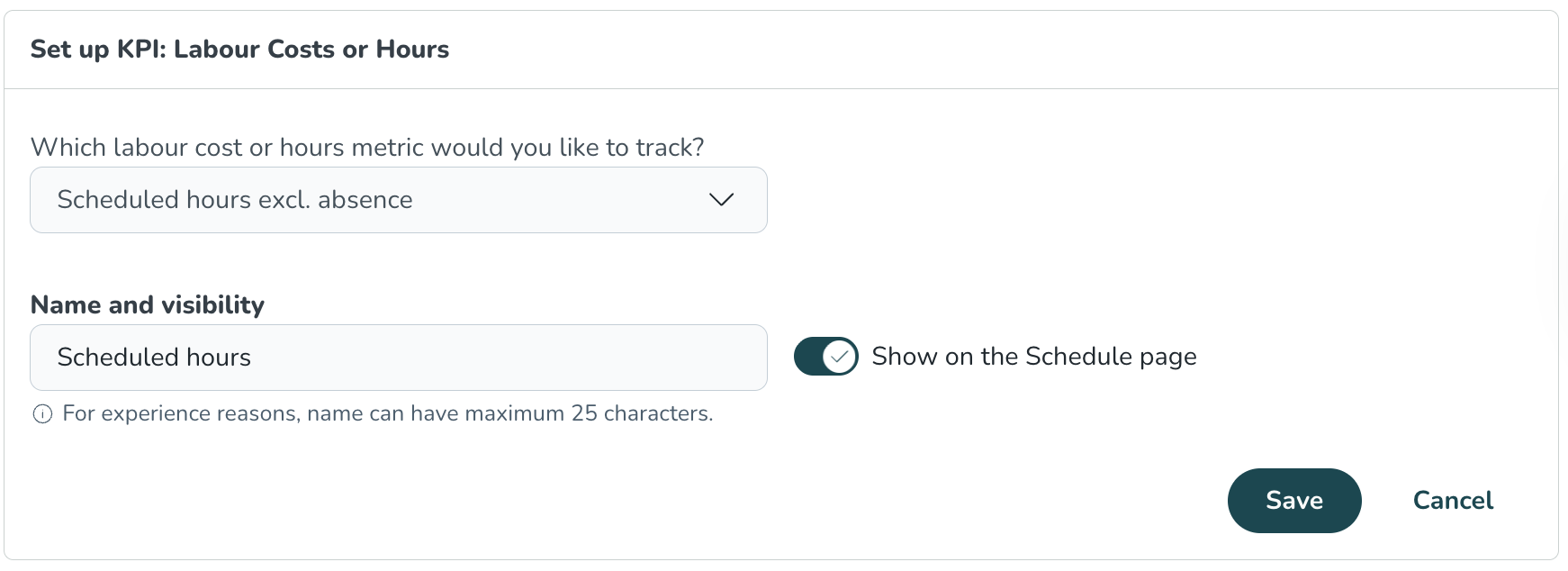 To configure this KPI, navigate to the Optimisation settings, open Scheduling KPIs and Targets, and choose to create Labour Cost or Hours KPI.