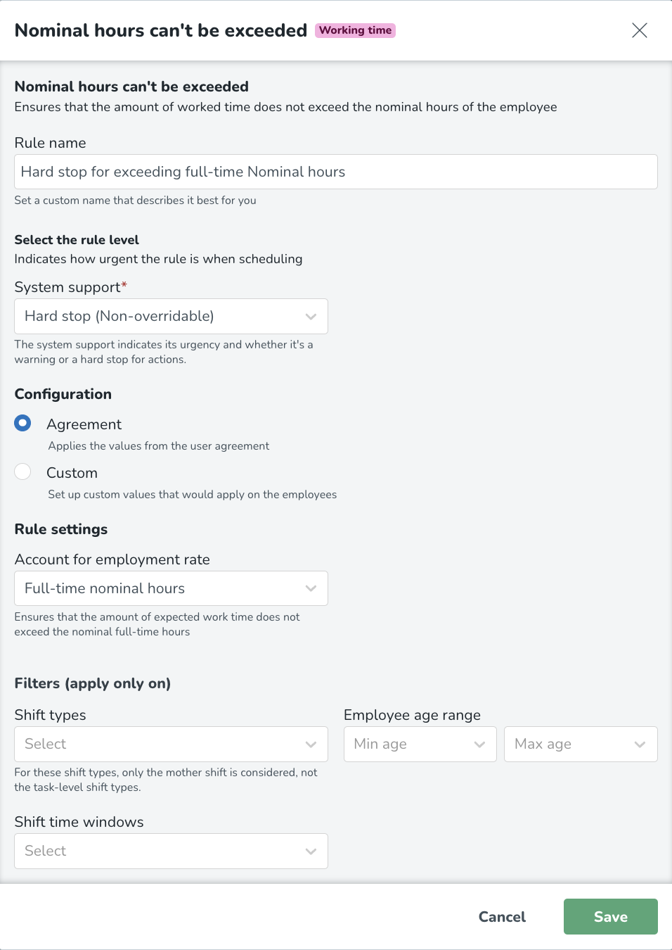 - Create a new rule: Add a “Nominal hours can’t be exceeded” rule that focuses on full-time Nominal hours.
