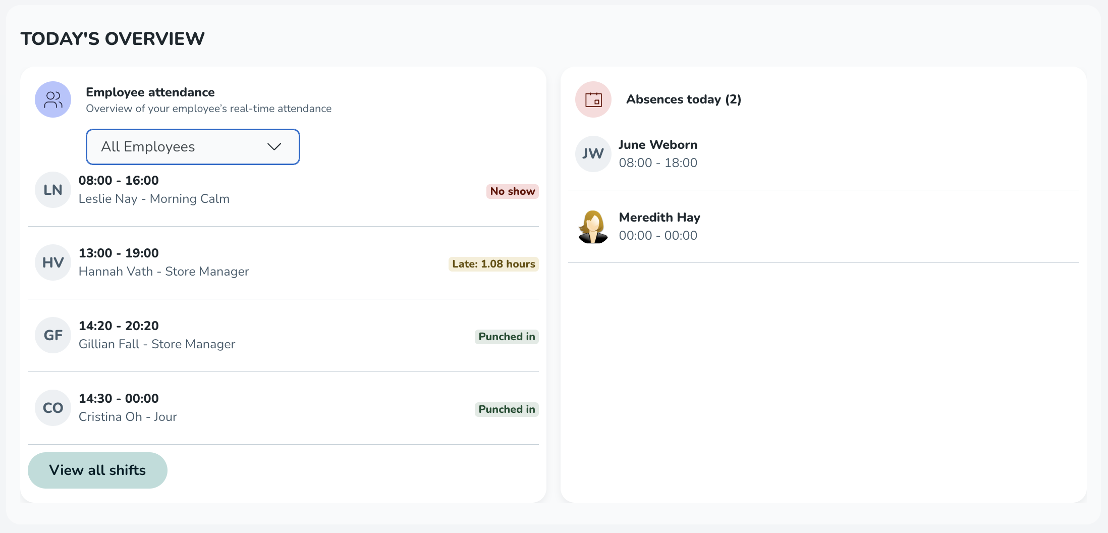 Today’s Overview consists of two parts: Employee attendance and Absences today.
