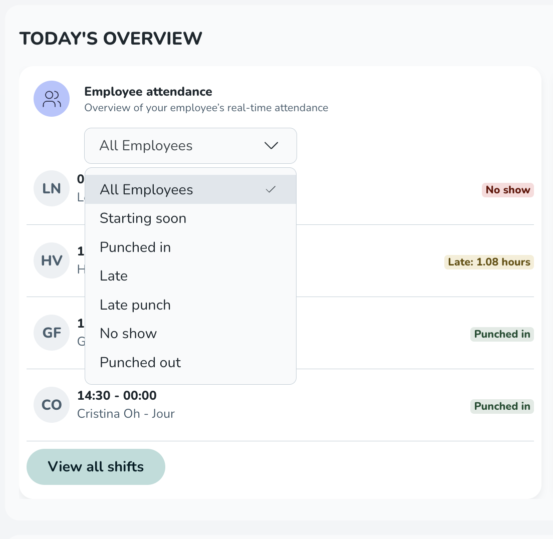 It’s the view you open first thing in the morning and revisit throughout the day to make sure you have the coverage you need. If someone arrives late, misses a punch, or an absence creates a staffing gap, you’ll see it right away. That makes it much easier to take action - reassign a shift, arrange cover, or handle potential issues before they grow.