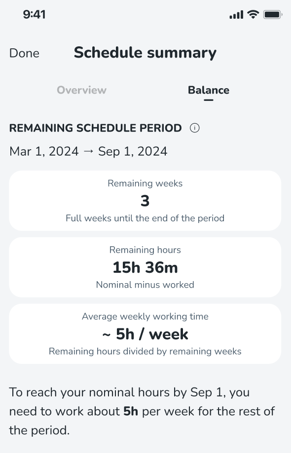We have now made it easier for you to visualise the number of weeks/hours you have left to work during your current schedule period, as well as your suggested average weekly working time. We have introduced a new ‘Balance’ tab to the ‘Schedule summary’ view, which contains the following information: