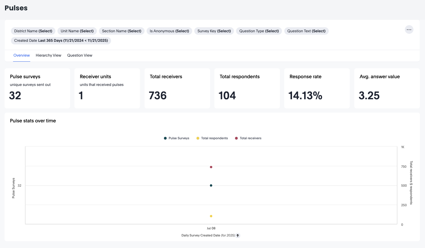 The Overview tab provides headline metrics and a snapshot of pulse survey activity across your selected time range and filters.