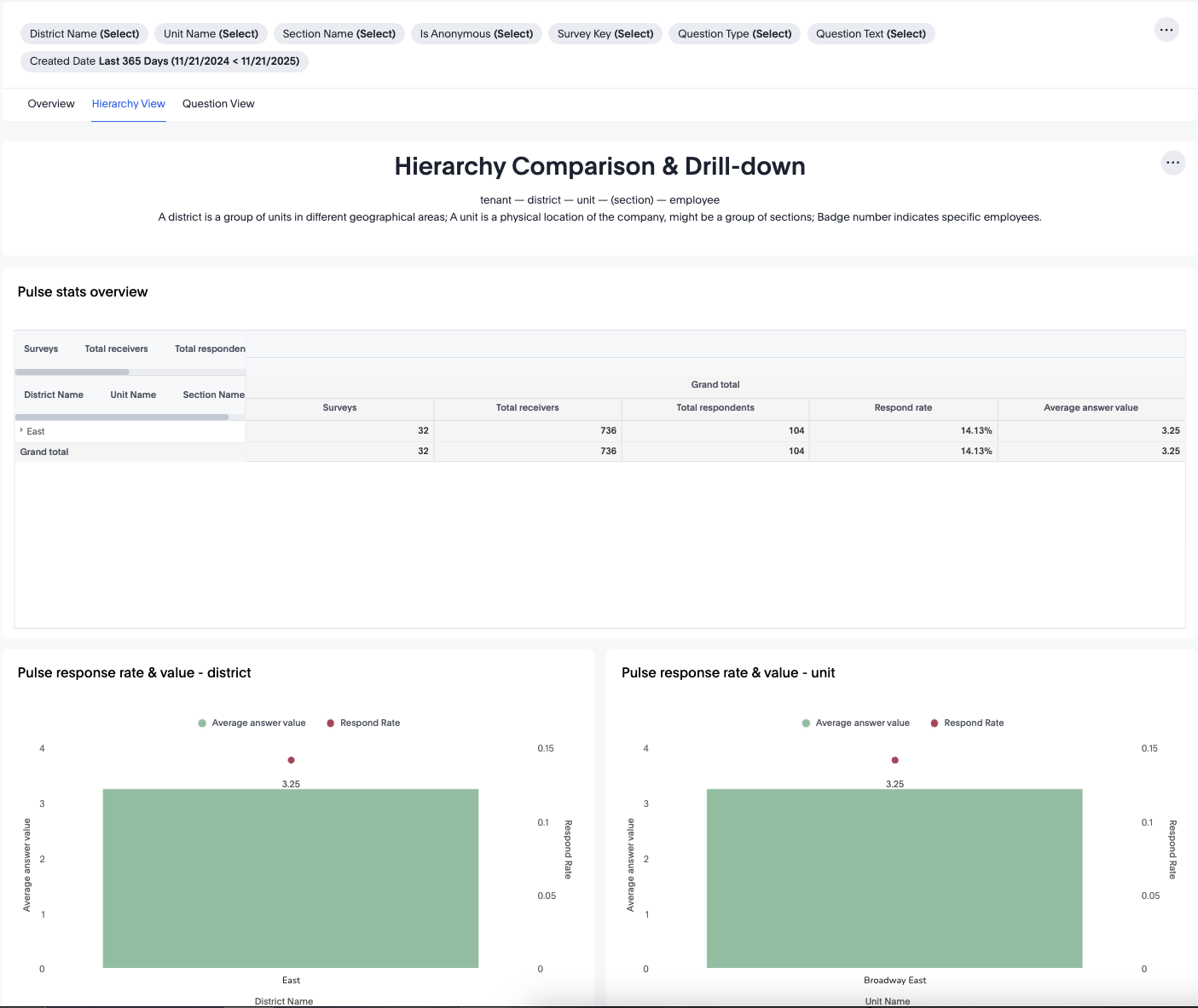 Track how many employees respond to pulse surveys and how engaged each unit is.