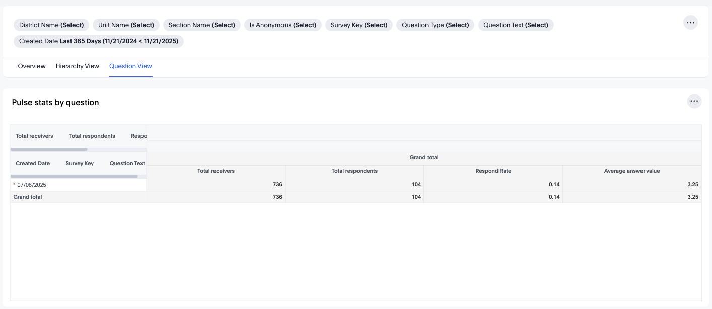 The Pulse Dashboards provide a clear and comprehensive overview of how employees engage with pulse surveys across your organisation. These dashboards help you track survey reach, response behaviour, answer quality, and engagement across units, districts, sections, and even individual survey questions.