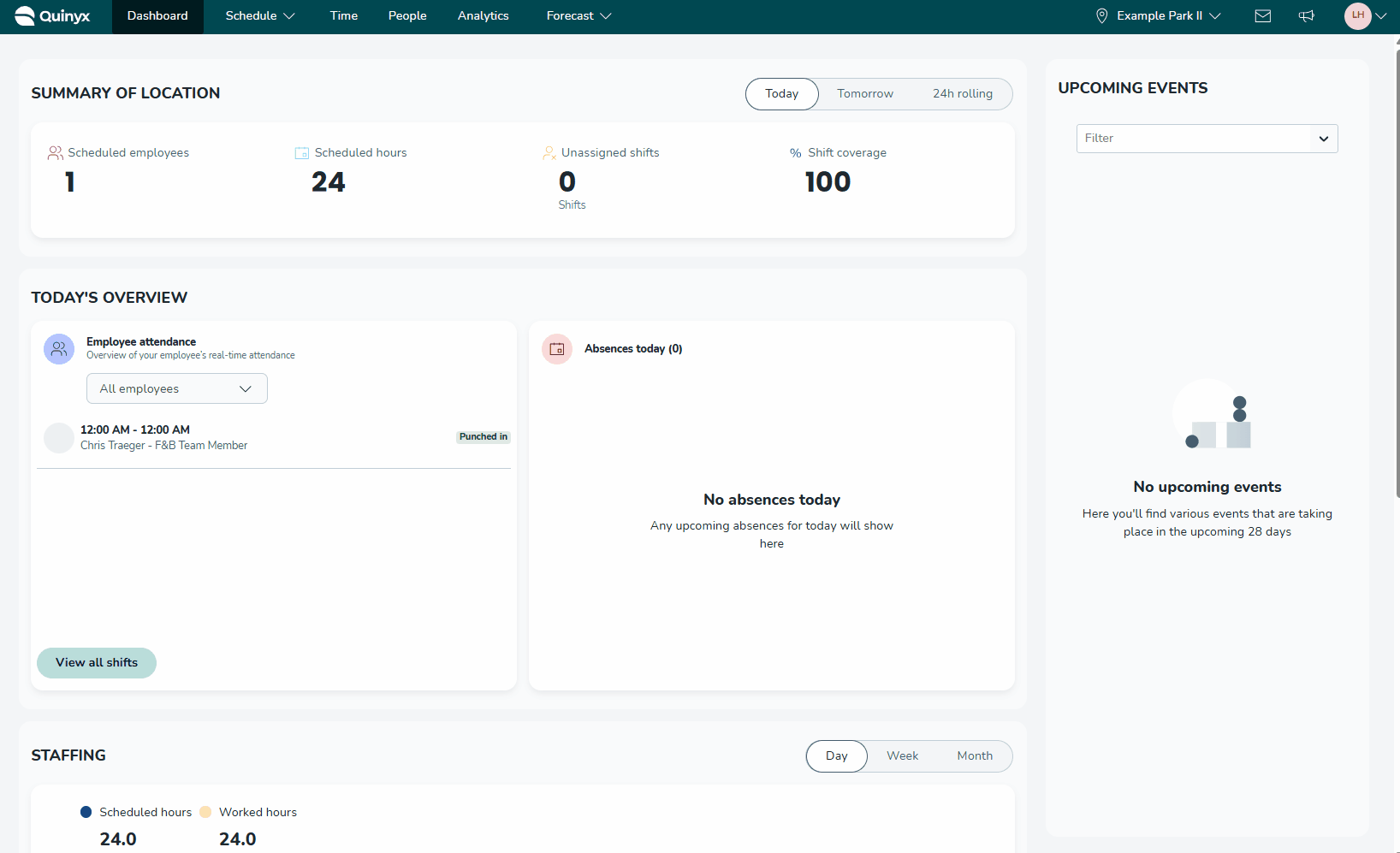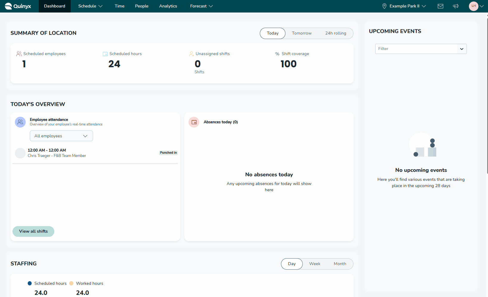 Quinyx cannot predict when the employee will punch out, so it continues showing scheduled shift hours until the shift is complete and the actual worked hours are confirmed.