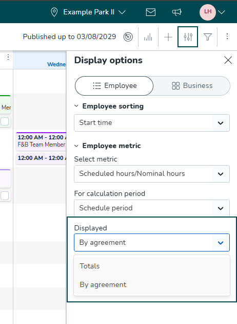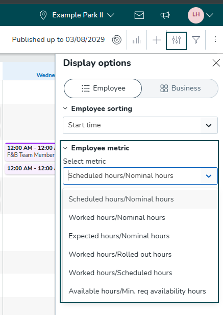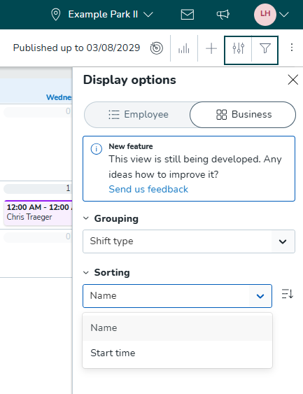 To access the business view display settings, click the Display options icon (sliders) located in the top right corner, next to the Filters button. This opens a side panel where you can toggle between Employee and Business tabs to customize your layout.