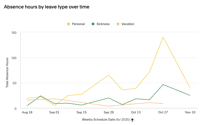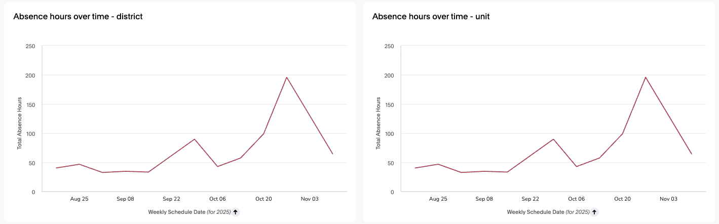 The time-series charts show whether certain weeks or seasons consistently produce higher absence.