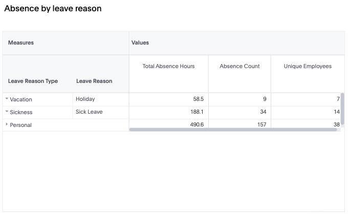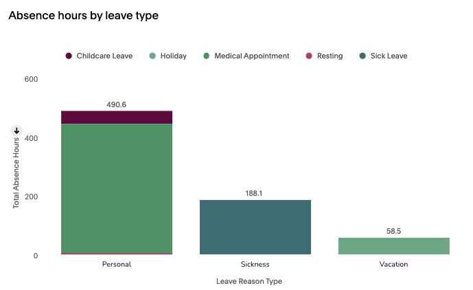 This table reveals exactly which reasons (e.g., Sick Leave, Holiday) drive absence hours.