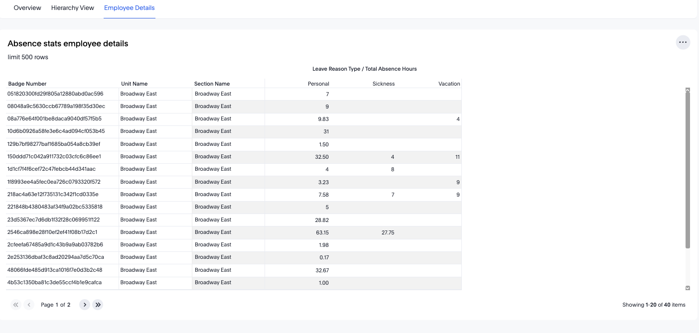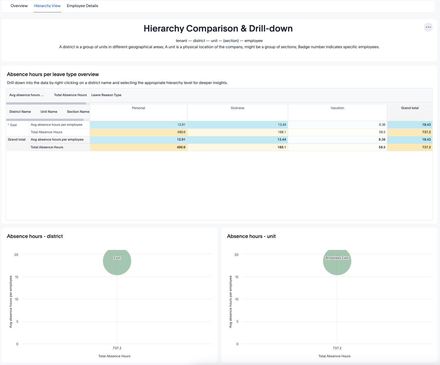 The Hierarchy View allows you to analyze absences by organizational structure: