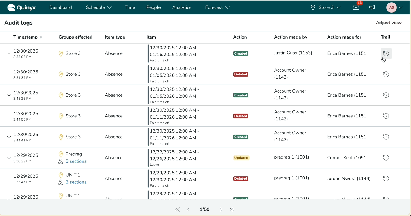 - As the logging of shift data in the current audit logs began on 2023-06-07, a disclaimer will display in cases when you’re viewing the trail of a shift whose creation took place before that date since data prior to that date can only be accessed by Quinyx's Support team.