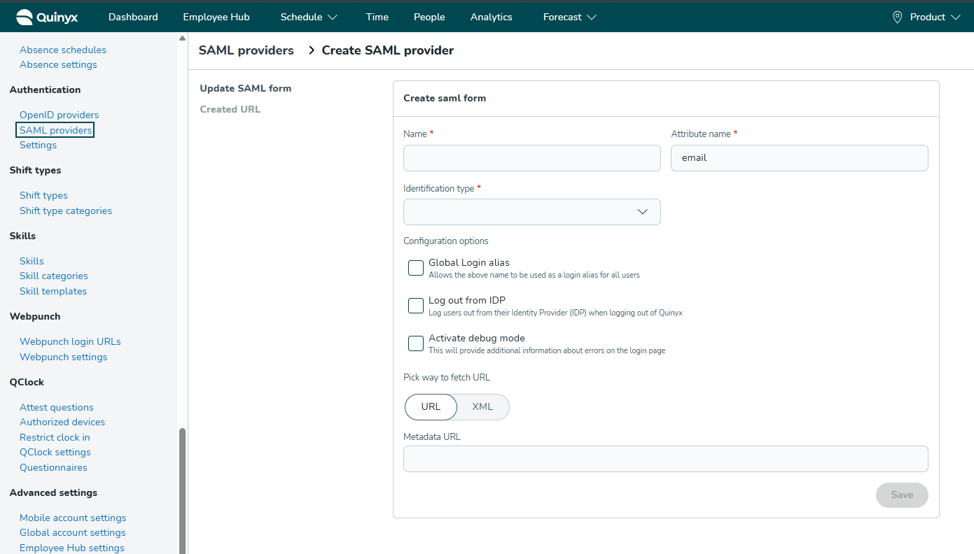 - URL (Recommended): Select URL and paste the public Metadata URL provided by your IdP into the Metadata URL field. Quinyx will keep the configuration in sync with this URL.
