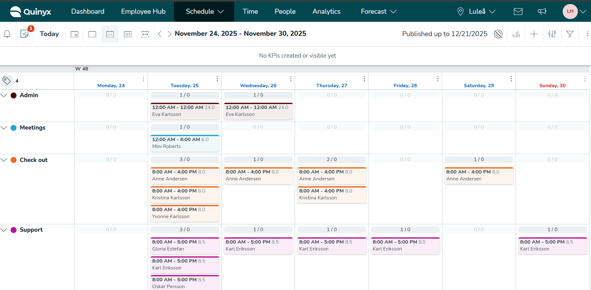 - Drag-and-drop: You can reassign shifts or fill open slots by dragging them between days or employees.
