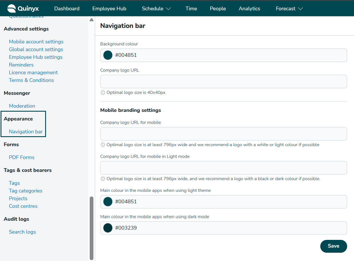 - Click the background color of your choice, or enter your company's custom HEX color code: