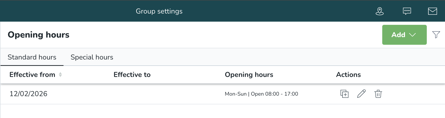If you open the Group Settings for a section, a new option will be visible in the left-hand menu: Opening hours. There, you can define both Standard and Special opening hours.