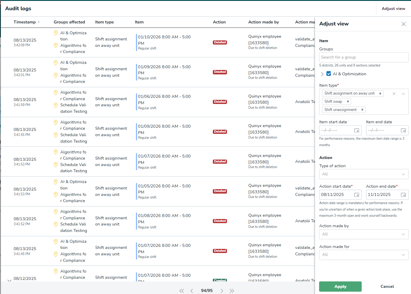 - However, suppose the action has been triggered by a specific feature that has cascading effects on other parts of Quinyx, such as deleting or reassigning the shift; this will display as the origin instead.
