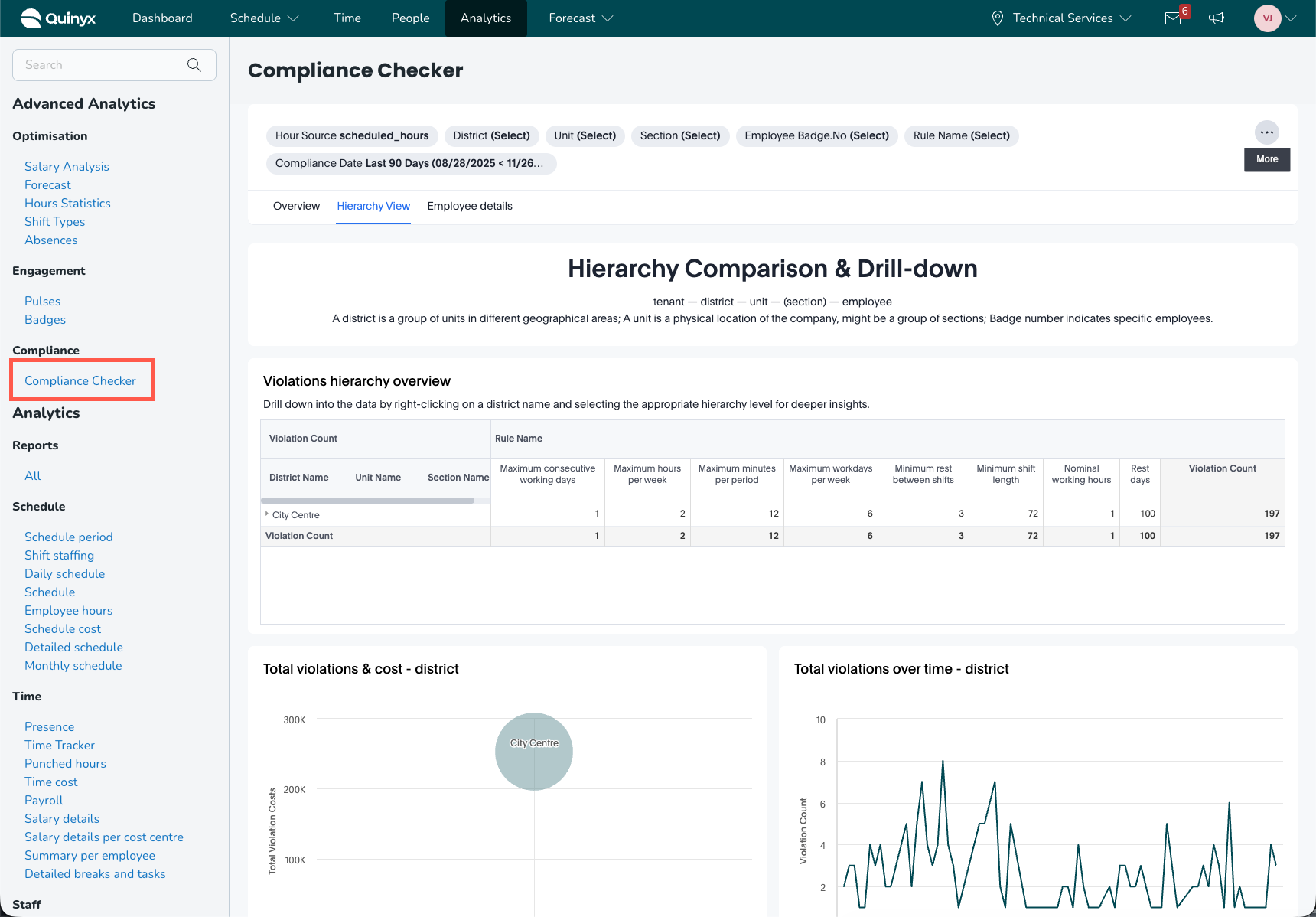 The position of the role within the organizational hierarchy will determine the scope of compliance data that is available to you. For example, if you activate Advanced Analytics: Compliance for a District Manager role, you will be able to see compliance data on a district level. Consequently, if you hold the District Manager role within a specific district, you will have access to the compliance data for that district, as well as for the units that are part of it.