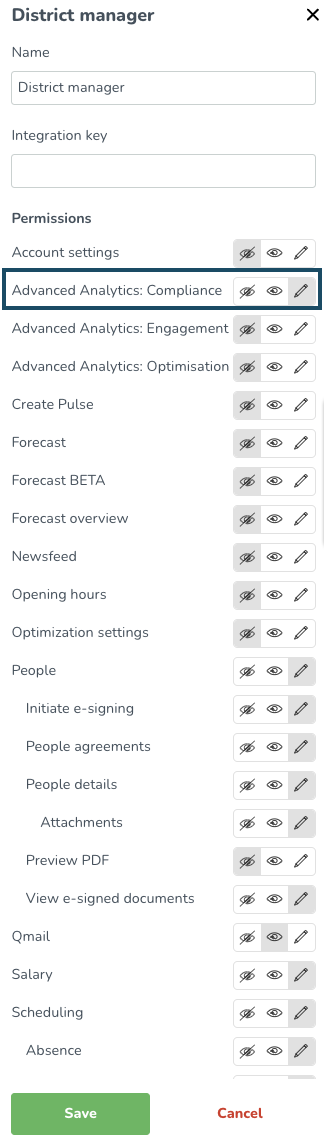 Once the Advanced Analytics modules have been activated, you can enable access for it by going to Account settings > Role management > [insert selected role] > Edit role > Advanced Analytics: "The area you want to enable".