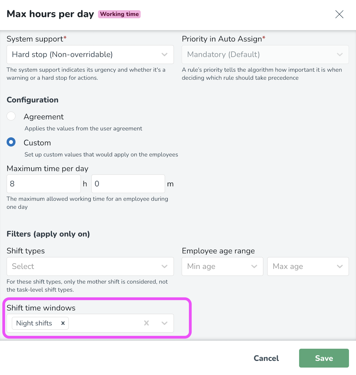 The shift time windows can then be added to a schedule compliance rule. That means that the rule only takes shifts into account that satisfy the shift time window. The filter works together with the existing shift type filter and employee age range filter.