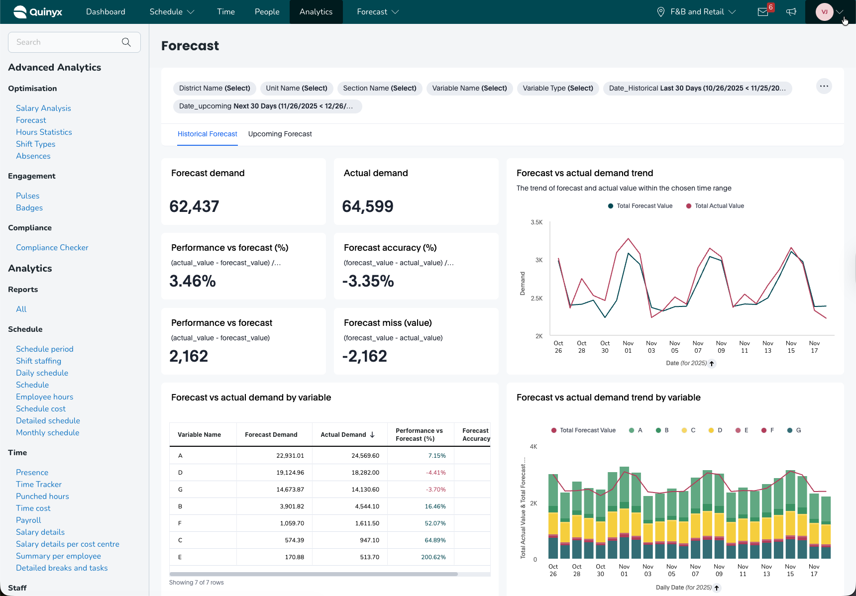 The Forecast Dashboard provides a comprehensive view of both historical performance and upcoming demand. With insights across variables, time trends, and organisational hierarchy, it empowers teams to optimise labour planning, increase forecast accuracy, and make informed operational decisions.
