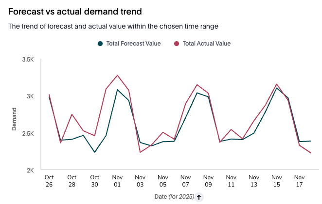 A time-series chart showing a daily comparison between forecast and actual demand.