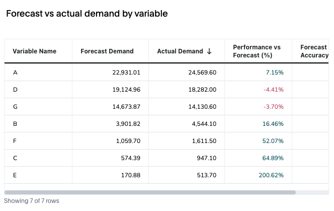 The Forecast dashboard provides a detailed comparison between forecasted demand and actual demand, giving operational teams clear insight into forecast accuracy, variable-level performance, and predictive confidence ranges. It supports both historical forecast analysis and upcoming forecast projections, enabling data-driven staffing and planning decisions.