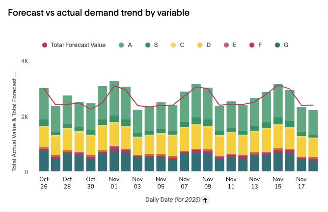 A bar graph and line trend show how each variable contributes to total demand and how the actual values compare to the forecast across days.