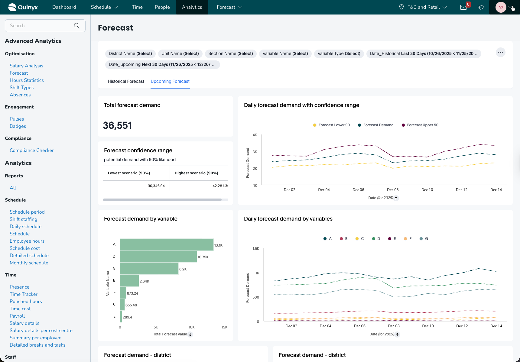 The Upcoming Forecast view predicts future demand and provides confidence intervals to support staffing and labour planning.