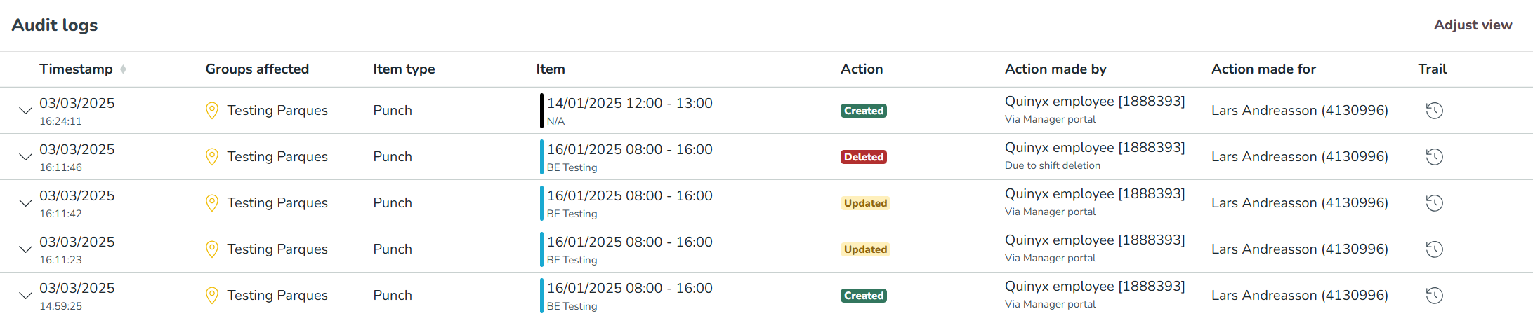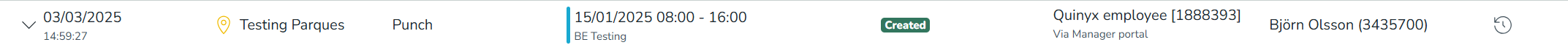In addition to multiple shifts' related audit logs, you can search for the punches audit logs in Quinyx. This provides you with information about who created, updated, or deleted specific punches, when, where (origin), and the action taken. This provides managers with a big picture to understand the punch changes and can be a great support for payroll and configuration troubleshooting.