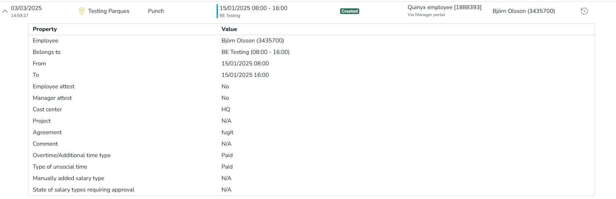 Manually added salary type | This property describes whether or not a salary type has been manually added to the timecard. If you add a salary type manually, we will display the [name of salary type] [custom salary code] and [quantity] added in the Update action By definition, the value of this property will always be "N/A" at punch creation unless there is a salary generated by agreement or any other rules that require approval; in that case, we will display "No". |