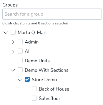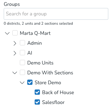 - Selecting a group automatically selects all of its child groups. Note that you're able to deselect all said child groups at your discretion. Example: In the first picture below, Quinyx will search for all items taking place in both the unit Store Demo and its sections: Back of House and Salesfloor. In the second image, we're searching for items that take place in Store Demo but not items that take place directly in the sections. This means punches with the shift section "Store Demo > Back of House" or "Store Demo > Salesfloor" will not be included in that search.
