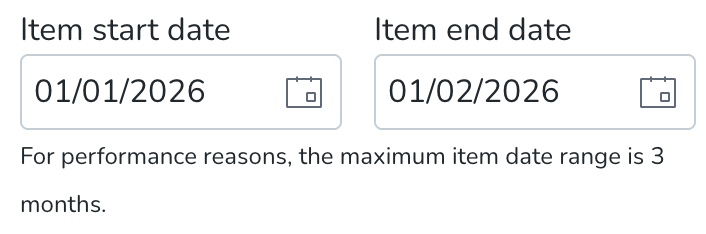 - The maximum period you’re able to specify using the Item start date and Item end date is three months.