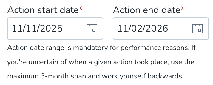 - The default values for these fields are three months from today's date for the "Action start date" field and today's date for the "Action end date" field. If you're uncertain of when a given action took place, use the maximum 3-month span and work backward.