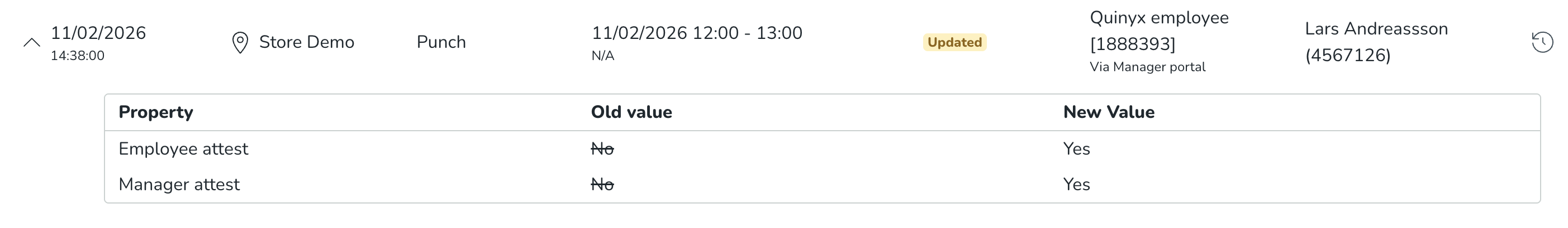 - When a sub-item has been created, we will display N/A with strikethrough as the value in the Old value column. When a sub-item has been deleted in Quinyx, we will display N/A as the value in the New value column.