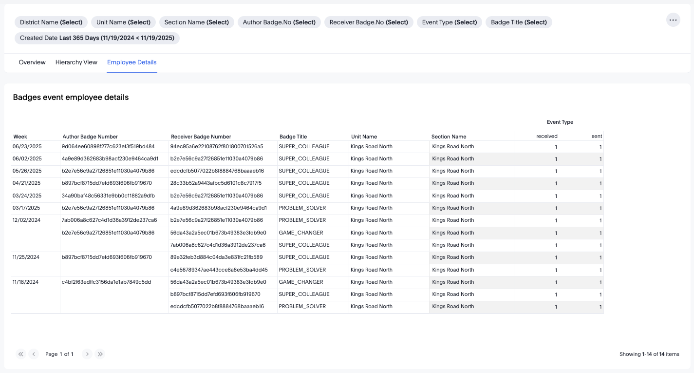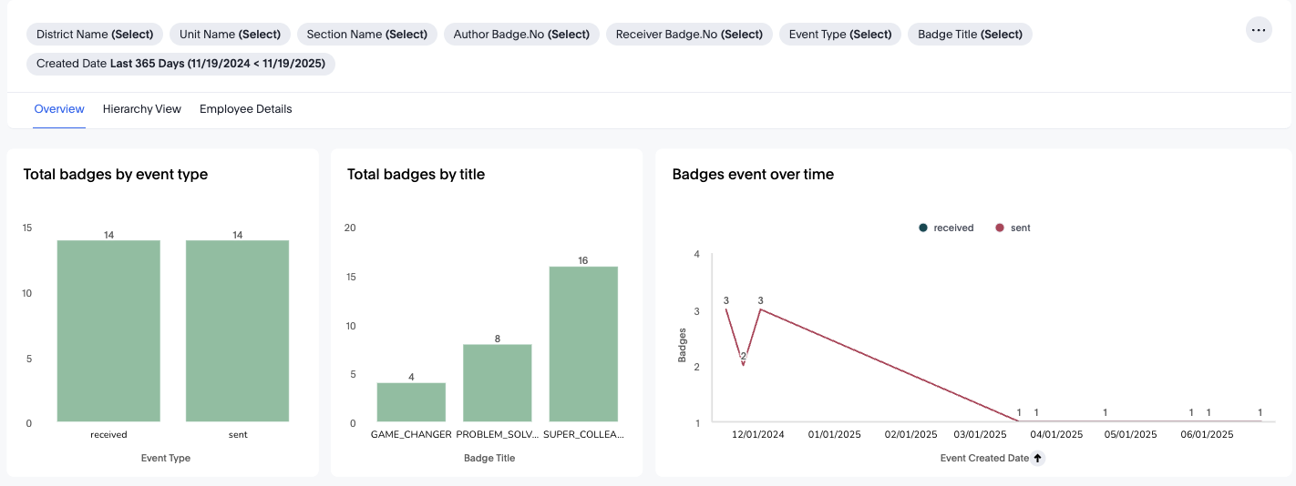 Shows how many badges were received vs sent. This helps you understand overall recognition flow and whether employees are actively engaging.
