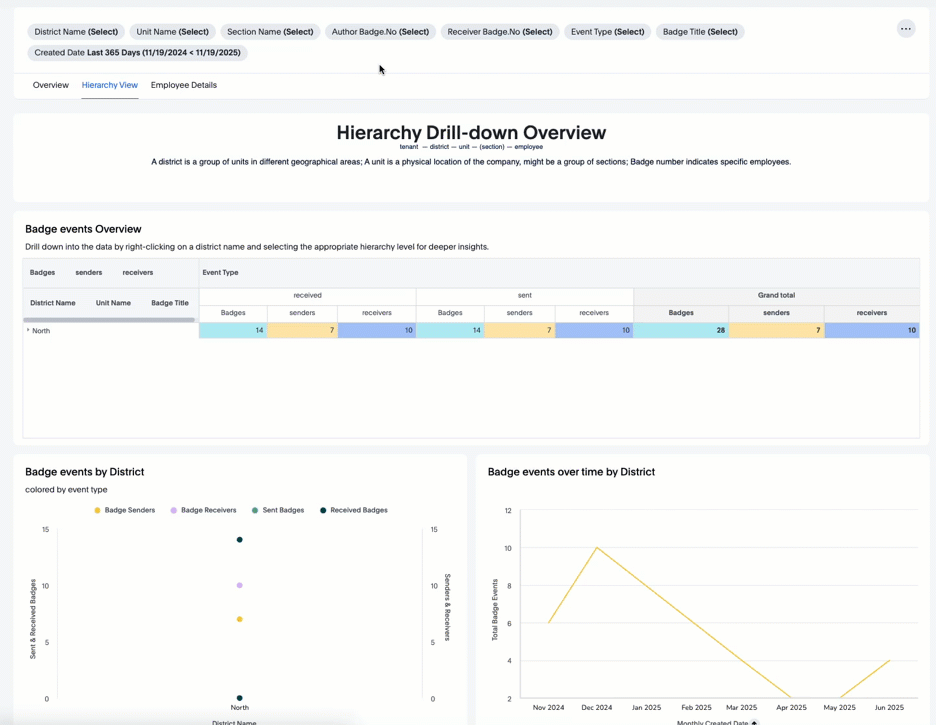 If some employees send many badges but don’t receive them—or vice versa—you can investigate possible morale or inclusion gaps.