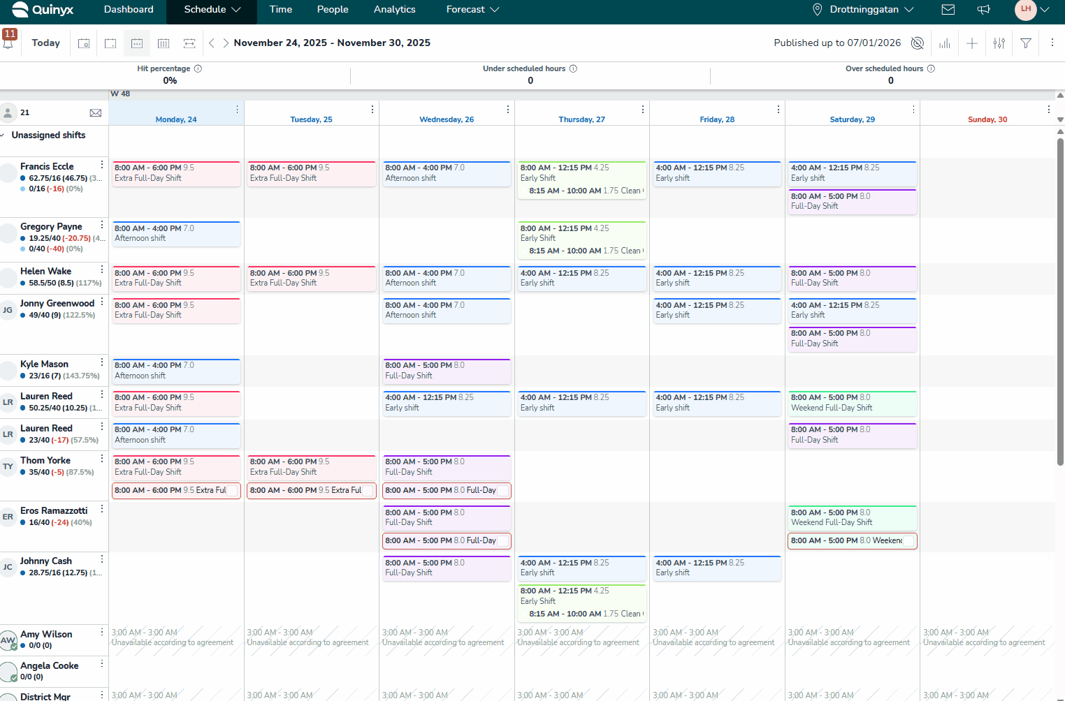 When creating shifts in the schedule, Quinyx will validate the shift details against agreement settings and unit settings. These validations take place any time an existing one is edited or a new one is added, be it in the Notifications panel or directly in the schedule. These validations also take place for absence shifts, including when creating leaves and when approving leave applications. If the user continues creating or editing a shift despite receiving a warning message, Quinyx will log this circumvention.