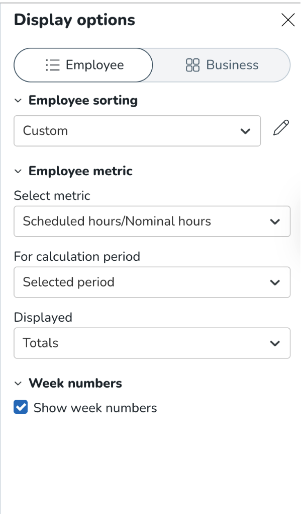 You can choose how the metrics are displayed for employees on the left-hand side of the schedule.