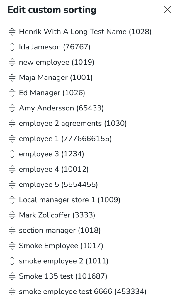 Managers can manually reorder employees in the scheduling view using simple drag-and-drop controls inside the Custom sorting panel. This allows you to arrange employees by role, experience, or priority.