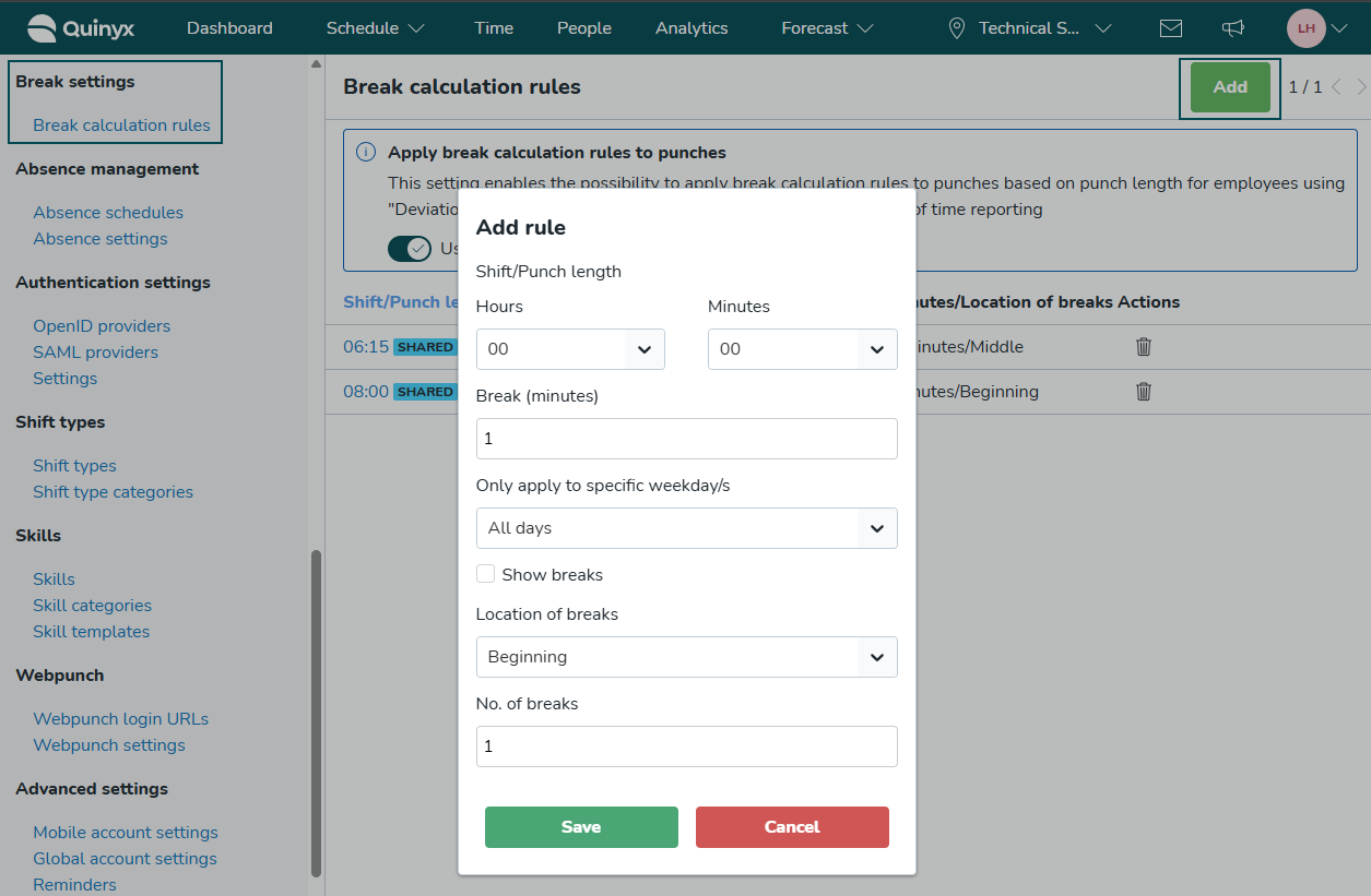 Break calculation rules can be set up in two places: Account settings and Group settings (available only at the unit level).