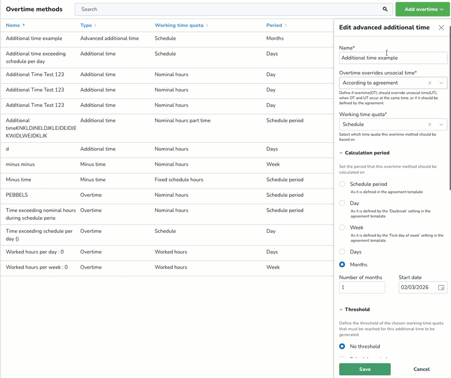 Quinyx biedt verschillende berekeningsmethoden voor overuren en extra tijd. Onder Accountinstellingen > Overeenkomsten > Overurenmethoden vindt u een sectie met de naam ‘Overurenmethoden’. Wanneer u naar die sectie navigeert, ziet u een lijst met alle beschikbare overurenmethoden. Geavanceerde methoden voor extra tijd worden behandeld als overurenmethoden, zowel wat betreft configureerbaarheid als in overeenkomstenjablonen. U hebt nu echter de mogelijkheid om geavanceerde methoden voor extra tijd te creëren vanuit een eigen zijmodaal venster.