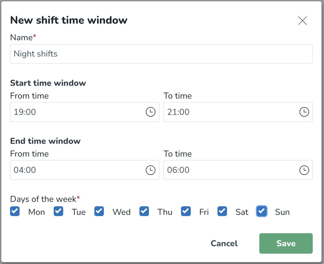 - Voeg een nieuw Shift-tijdvenster toe door het volgende op te geven: